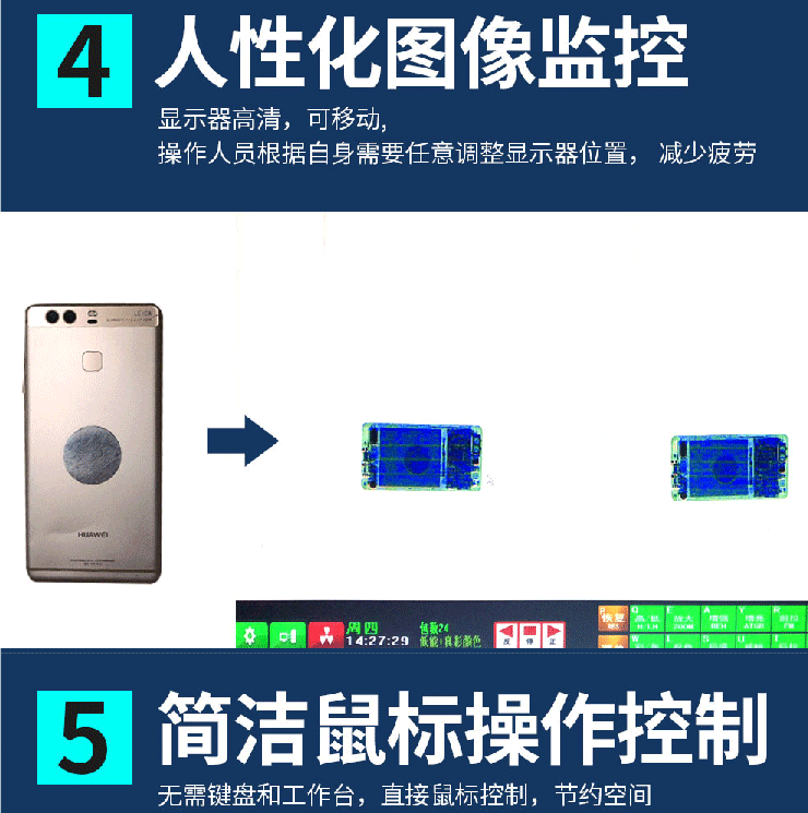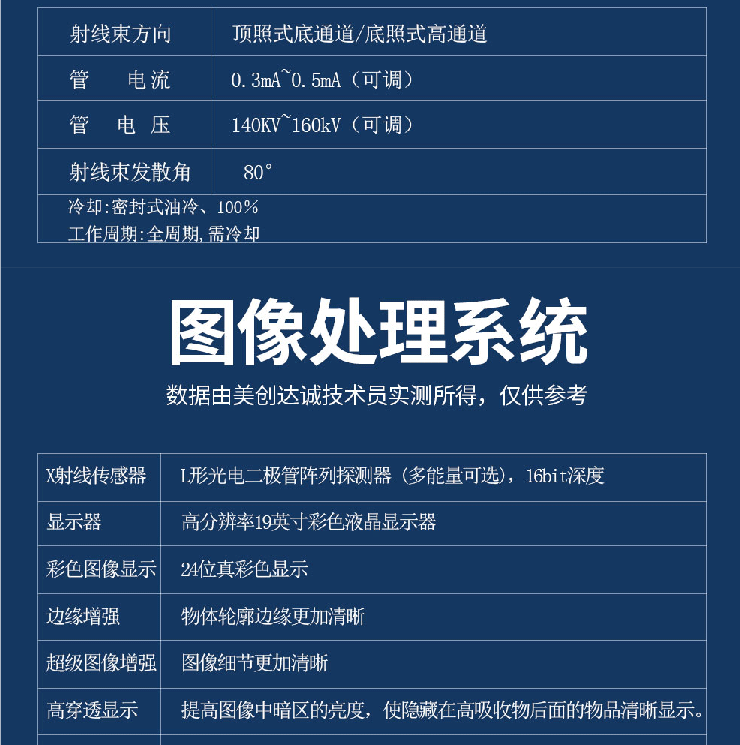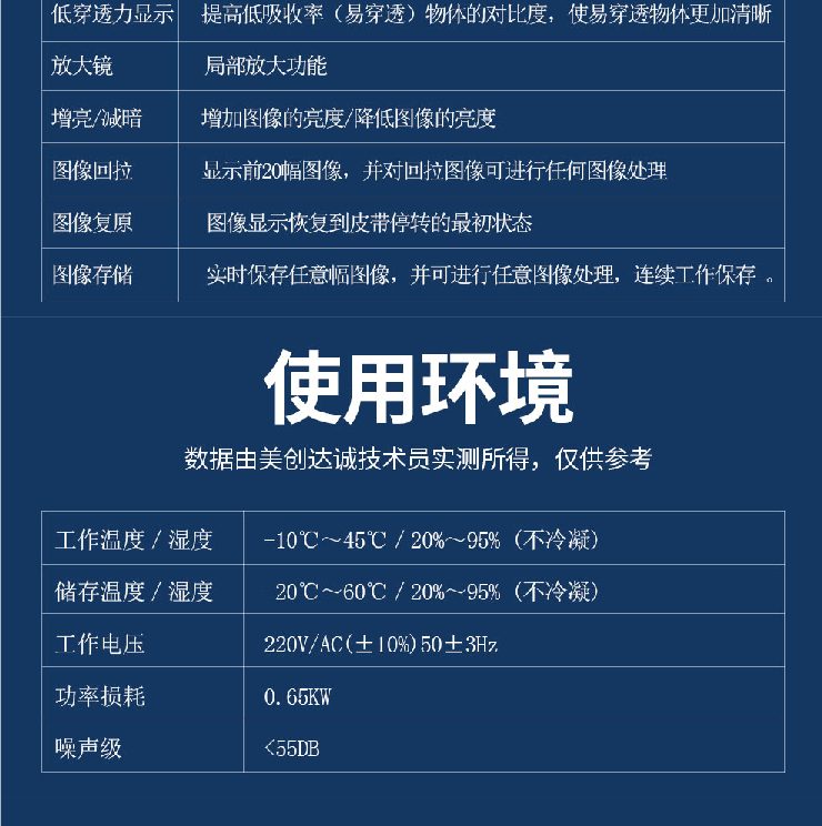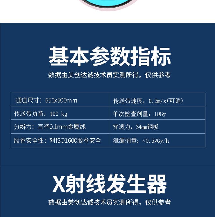 用于射線穿透檢查,可發(fā)現(xiàn)物體內(nèi)部的金屬結(jié)構(gòu),能顯示肉眼看不到地方。應(yīng)用于工廠檢驗(yàn)產(chǎn)品及事業(yè)單位的安檢如:電子廠、鞋廠、玩具廠,法院、車站、以及大型活動(dòng)的手提包的安檢。