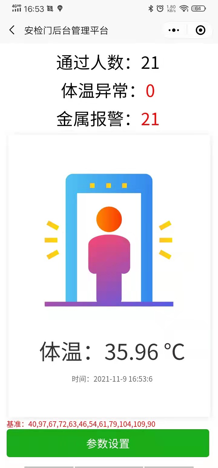 設(shè)備可通過打開手機(jī)藍(lán)牙,使用專用微信小程序搜索“安檢平臺”實(shí)時(shí)查看當(dāng)前檢測信息,包含金屬報(bào)警信息,溫度檢測數(shù)據(jù)等,也可通過手機(jī)小程序?qū)υO(shè)備參數(shù)進(jìn)行設(shè)置,包括設(shè)置金屬檢測靈敏度,實(shí)時(shí)查看當(dāng)前檢測信息,包含金屬報(bào)警信息,溫度檢測數(shù)據(jù)等;連接界面如下:
