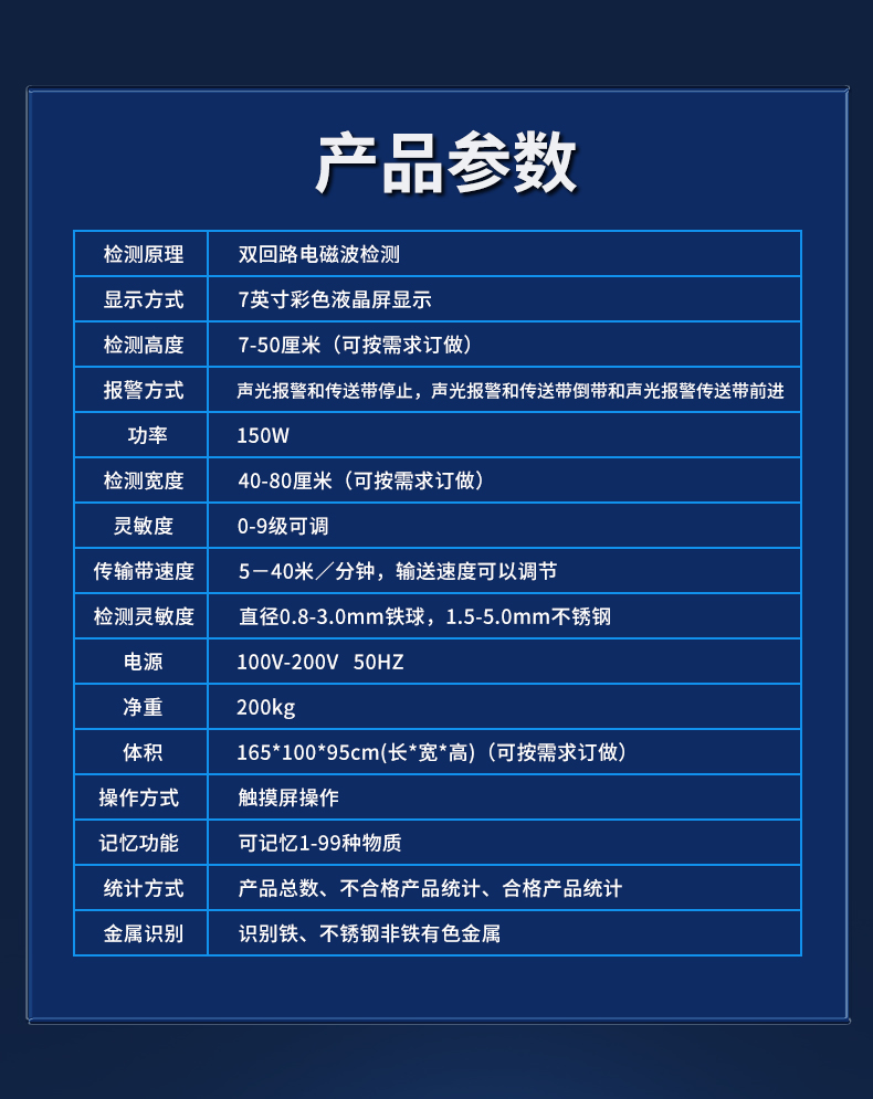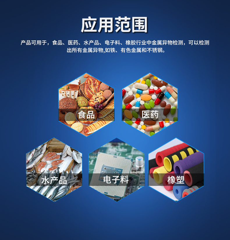 6、檢測(cè)靈敏度:直徑0.8-3.0mm鐵球,1.5-5.0mm不銹鋼(探測(cè)精度與機(jī)器的高度和寬度有直接關(guān)系,通常高度越高,寬度越寬,機(jī)器的探測(cè)精度越低,反之,相反。)