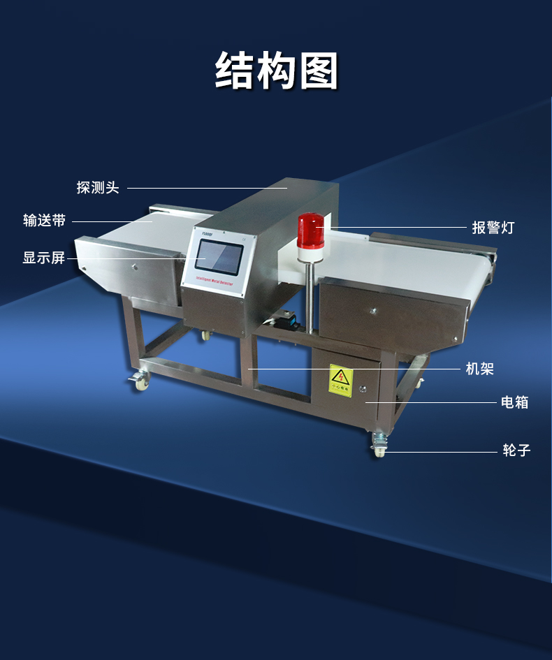 6、檢測(cè)到微量金屬時(shí),聲、光、儀表同時(shí)報(bào)警,不合格產(chǎn)品自動(dòng)返回到停止?fàn)顟B(tài)和排除裝置控制分離。