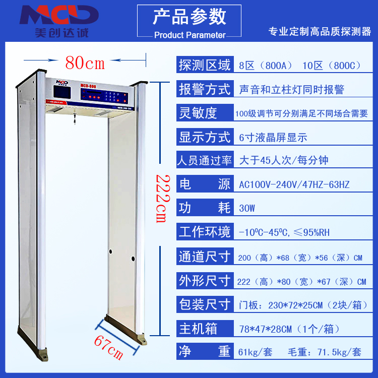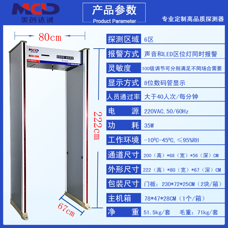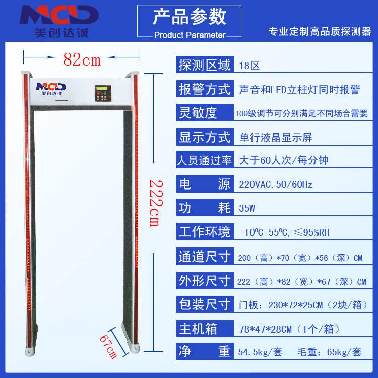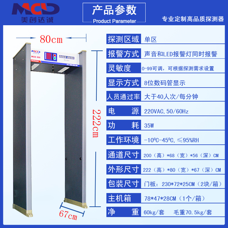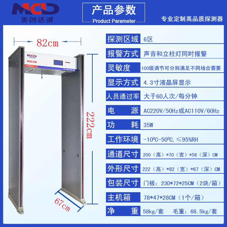 MCD—600安檢門(mén)當(dāng)人體攜帶金屬物品通過(guò)時(shí)能產(chǎn)生報(bào)警的裝置,能準(zhǔn)確探測(cè)到人身上或手體包箱中攜帶的金屬物品或含有金屬的物品,如各種管制刀具、武器、金屬制品、電子產(chǎn)品及其他含有金屬的物品等