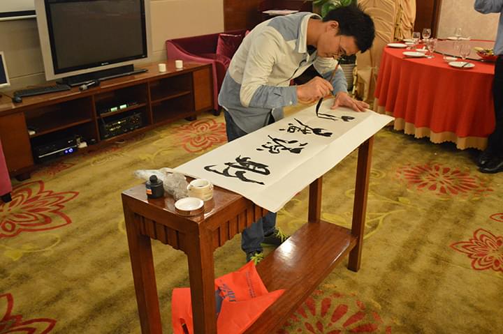 倉庫主管葉紅斌展示毛筆字預(yù)祝美創(chuàng)達(dá)誠2016:財(cái)源廣進(jìn)