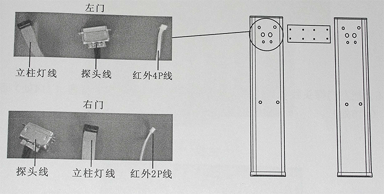 3、把左門紅外探頭 4P 線和右門紅外 2P 線分別插到主機(jī)箱控制數(shù)碼板上對(duì)應(yīng)的插座(J6 處)和(J7 處)。如下圖