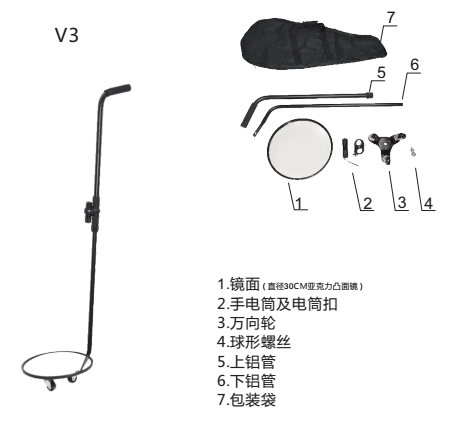 車(chē)底檢查鏡主要分為七個(gè)大部件,即:1鏡面、2手電筒及電筒扣、3萬(wàn)向輪、4球形螺絲、5上鋁管、6下鋁管、7.包裝袋,了解這些構(gòu)造才能更好的去掌握車(chē)底檢查鏡的使用方法,下附MCD-V3車(chē)底案例圖: