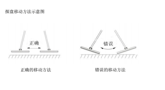 使用過程中不要像鐘擺一樣擺動(dòng)探盤,要提起探盤否側(cè)將出現(xiàn)錯(cuò)的探測(cè)讀數(shù),最好是從一邊到另一邊成一個(gè)15厘米寬的弧線橫向掃動(dòng),要保持探盤與地面平行,掃動(dòng)速度要慢。速度快可能錯(cuò)過要探測(cè)的目標(biāo)。配圖如下: