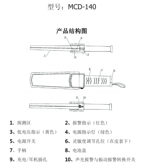 5.電源開關(guān) 6.靈敏度調(diào)節(jié)孔位(在皮套下)